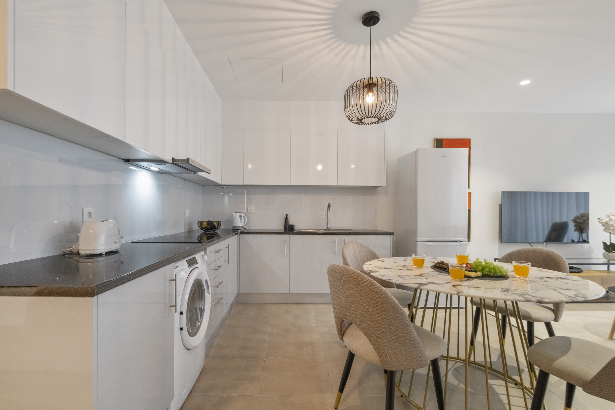 Im Herzen dieses Traumhauses befindet sich ein gemütliches Wohnzimmer, in dem der Essbereich sanft mit einer voll ausgestatteten Küche verschmilzt. Hier können Sie sich herausfordern, die Geheimnisse der madeirischen Küche zu erkunden, während Sie Momente der Verbundenheit und Freude teilen.