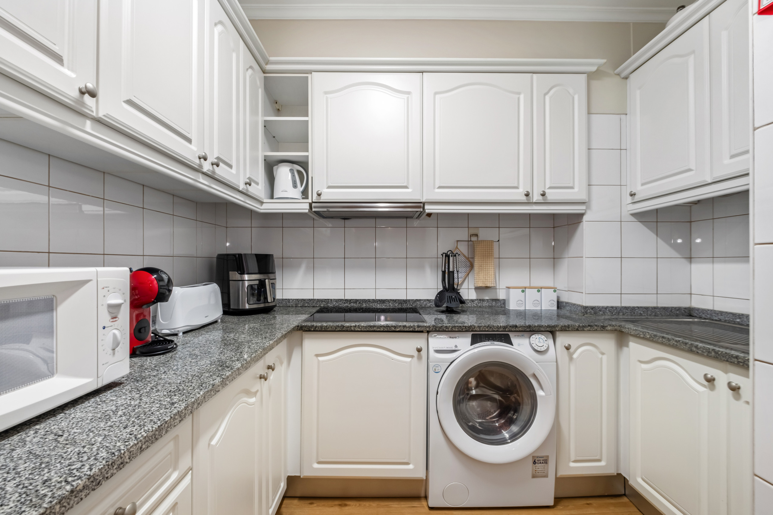 Die Offene Küche mit Induktions-Kochfeld ist ausgestattet in einen Kühlschrank, eine Mikrowelle, ein Backofen, Gefrierschrank, eine Spülmaschine, Geschirr/Besteck, Kochutensilien, eine Kaffeemaschine, einen Toaster, einen Wasserkocher, Teller und Schüsseln, Küchengeschirr.