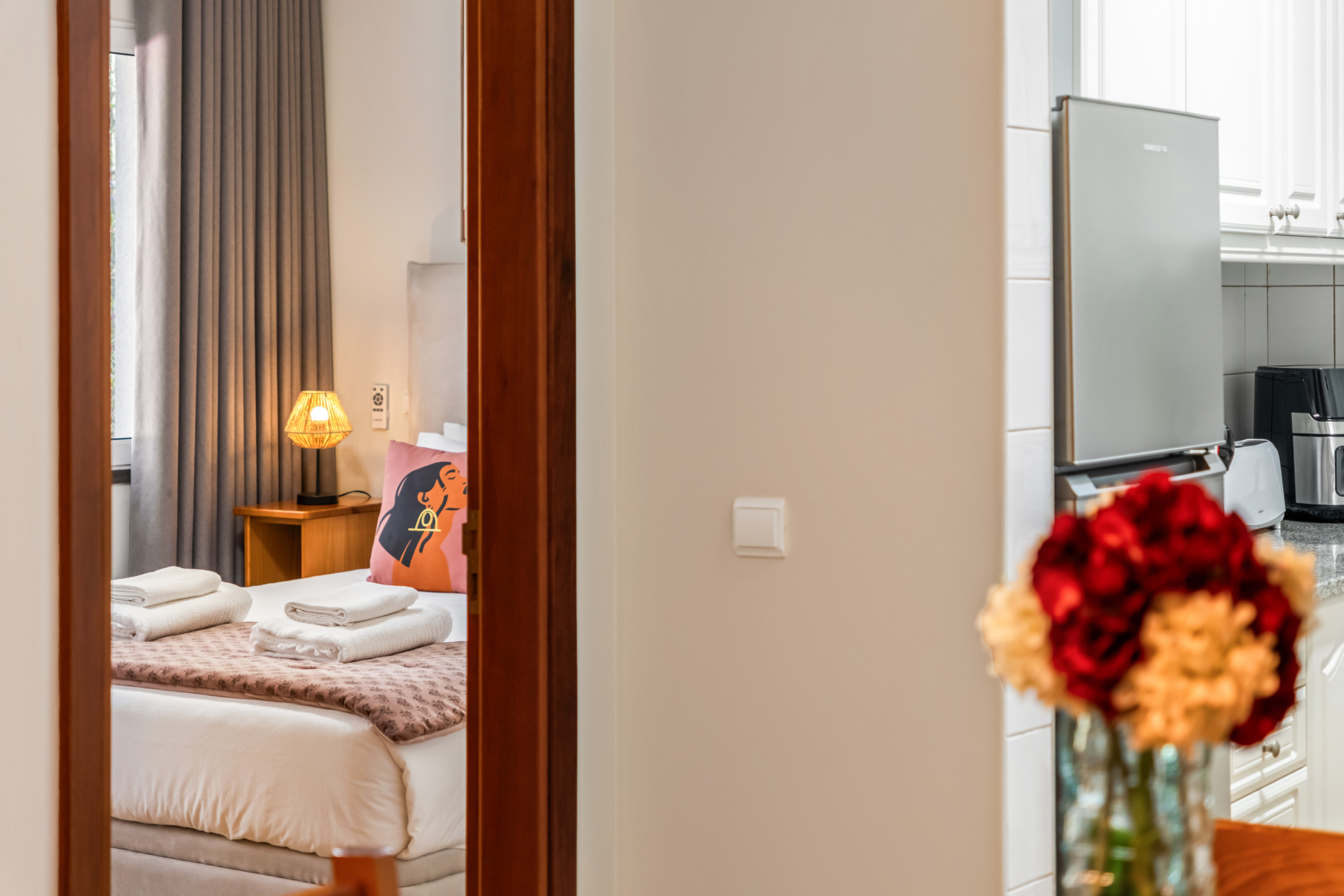 El apartamento dispone además de una habitación confortable con cama de matrimonio, pensada para proporcionar noches tranquilas y revitalizantes, complementada por un armario funcional que garantiza organización y practicidad durante toda la estancia.