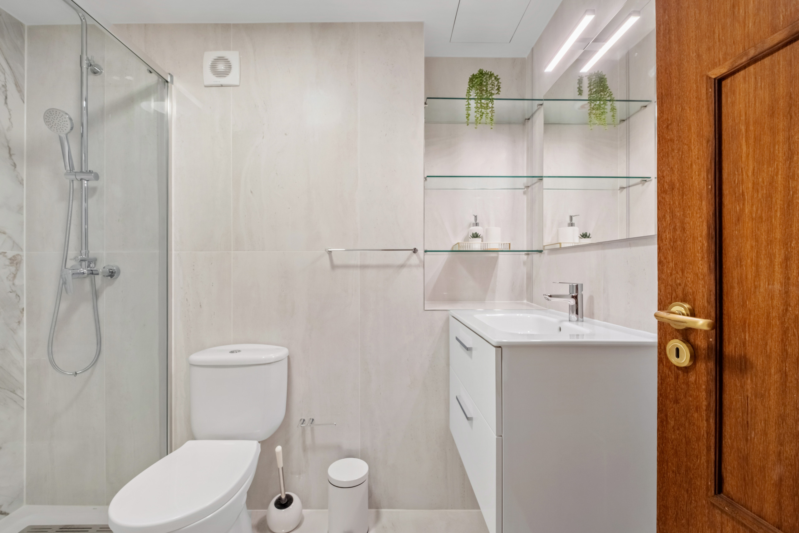 La salle de bains existante accueille tous les hôtes de l'appartement et il y a également un espace buanderie associé équipé d'une machine à laver, d'une corde à linge et d'autres petits articles ménagers.
