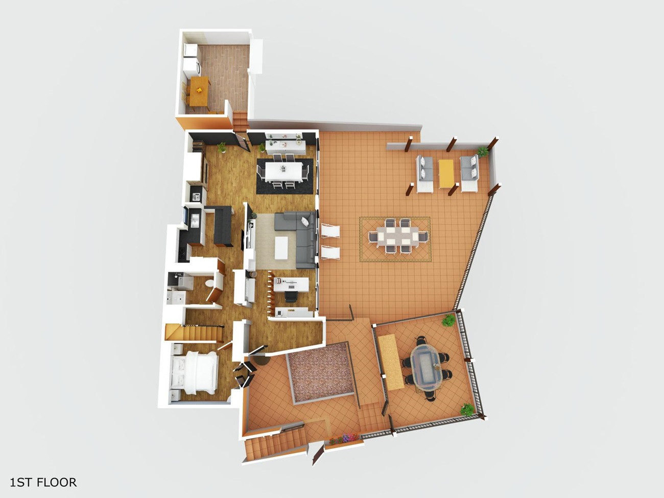 La cuisine ouverte entièrement équipée permet de préparer des repas en toute facilité, rendant la maison encore plus pratique. Le barbecue intégré, utilisé comme élément décoratif, ajoute du style et de la personnalité à l'espace.