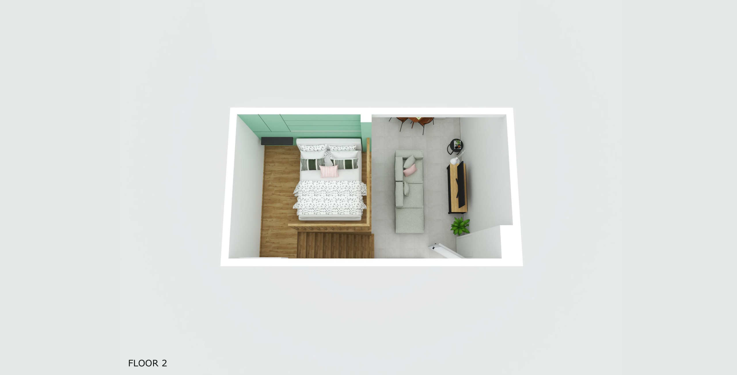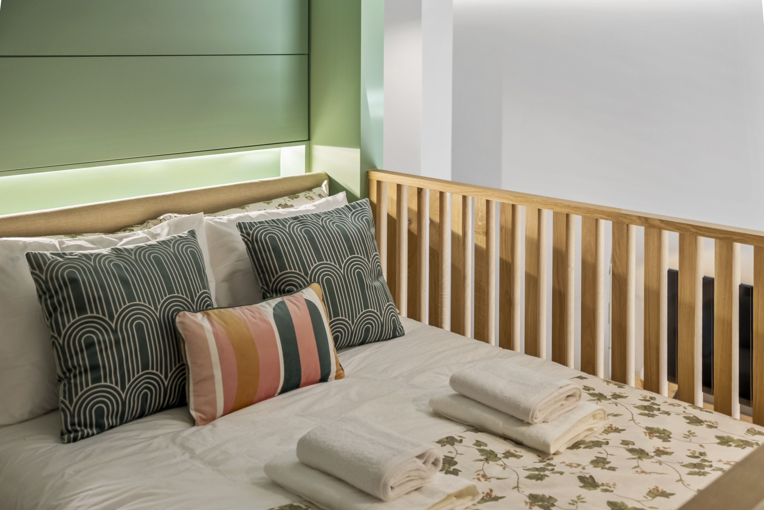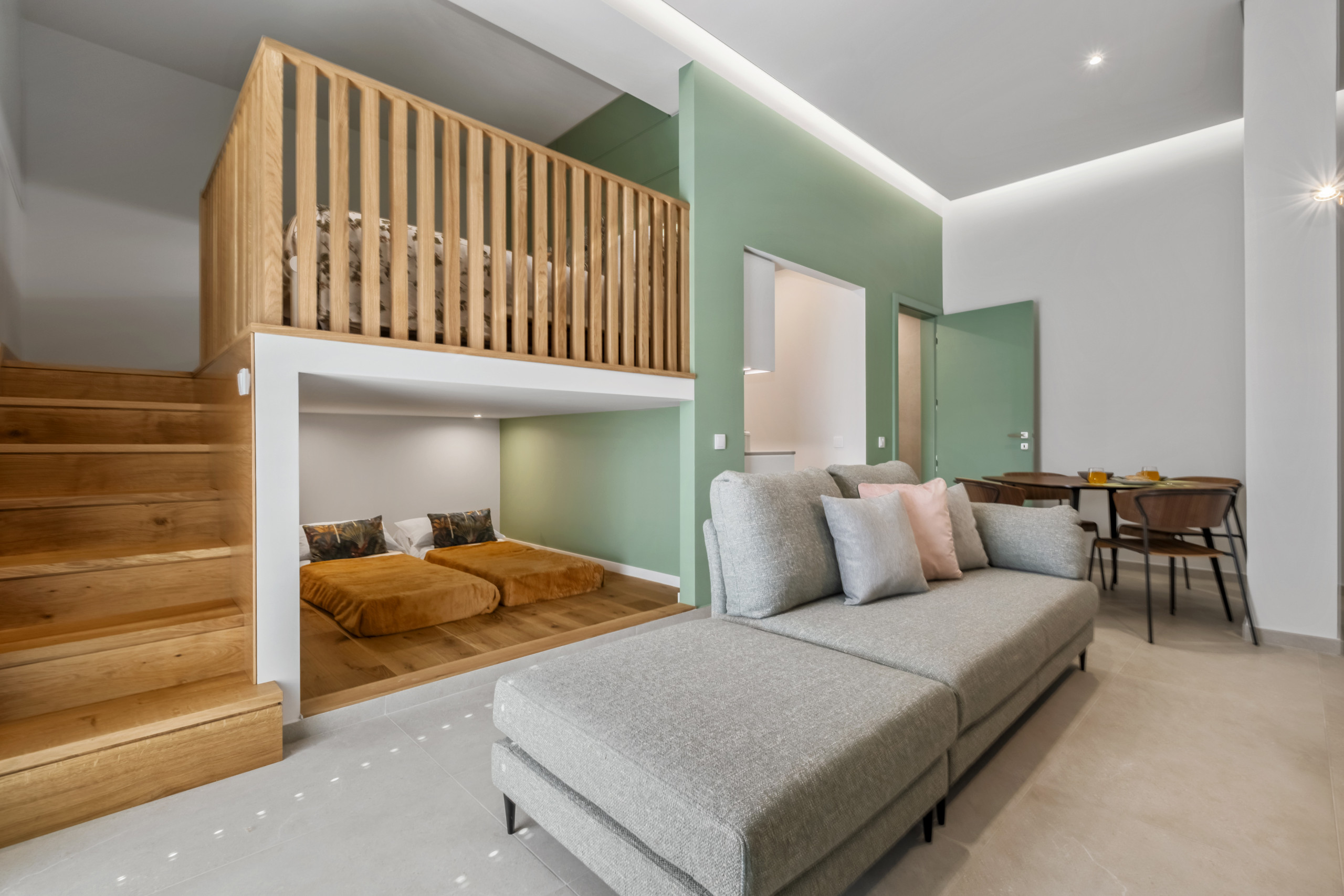 Dans l'espace de sommeil, l'environnement a été conçu pour garantir un repos absolu, avec un éclairage doux et une télévision, idéal pour les couples. Le studio comprend également deux lits supplémentaires, parfaits pour les jeunes enfants, sans compromettre le confort.