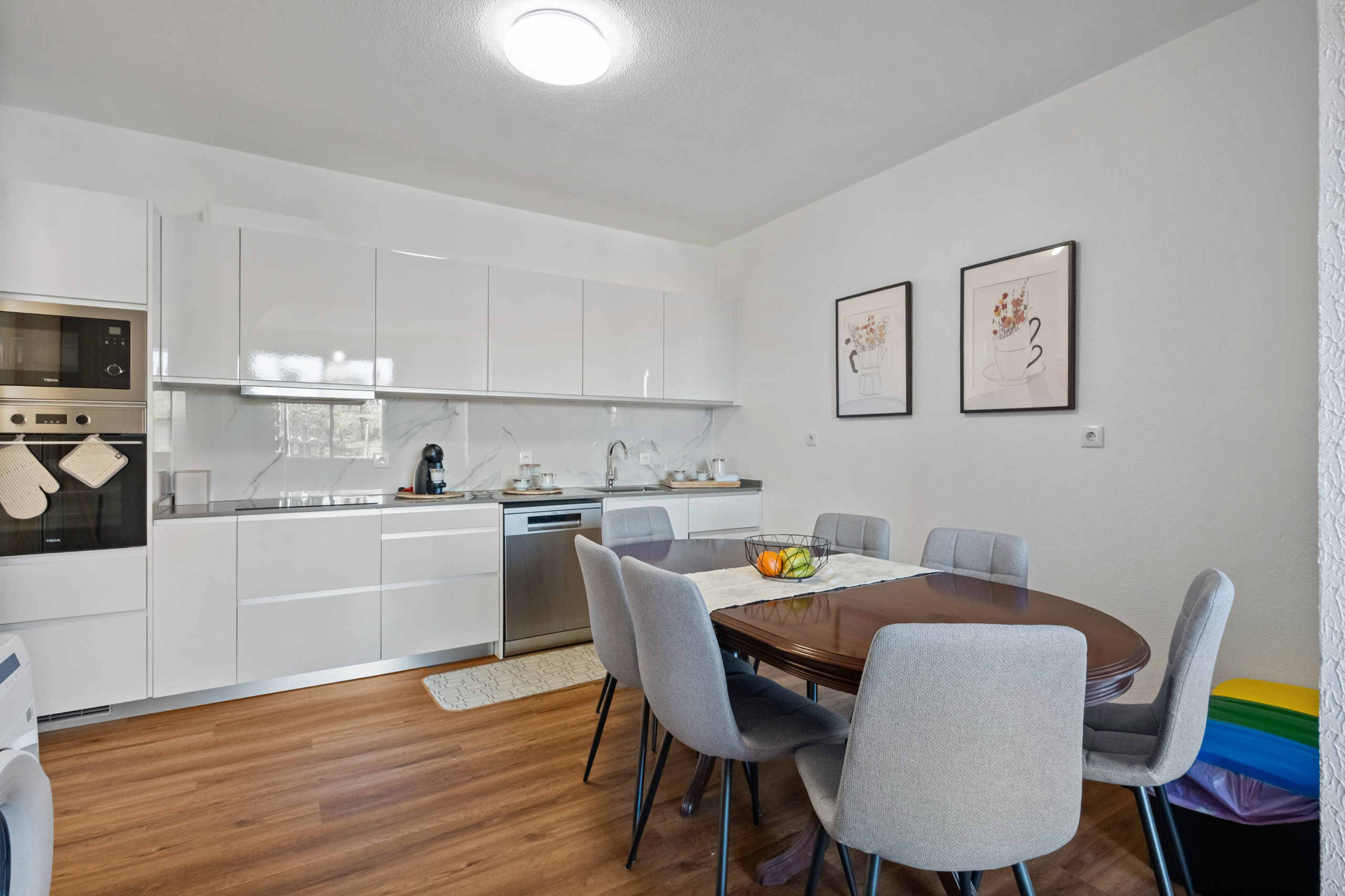 La cuisine est entièrement équipée, permettant de préparer des repas rapides comme des dîners plus élaborés, avec tout le confort. La table de salle à manger devient le point de rencontre idéal pour partager des moments en famille et créer des souvenirs inoubliables.