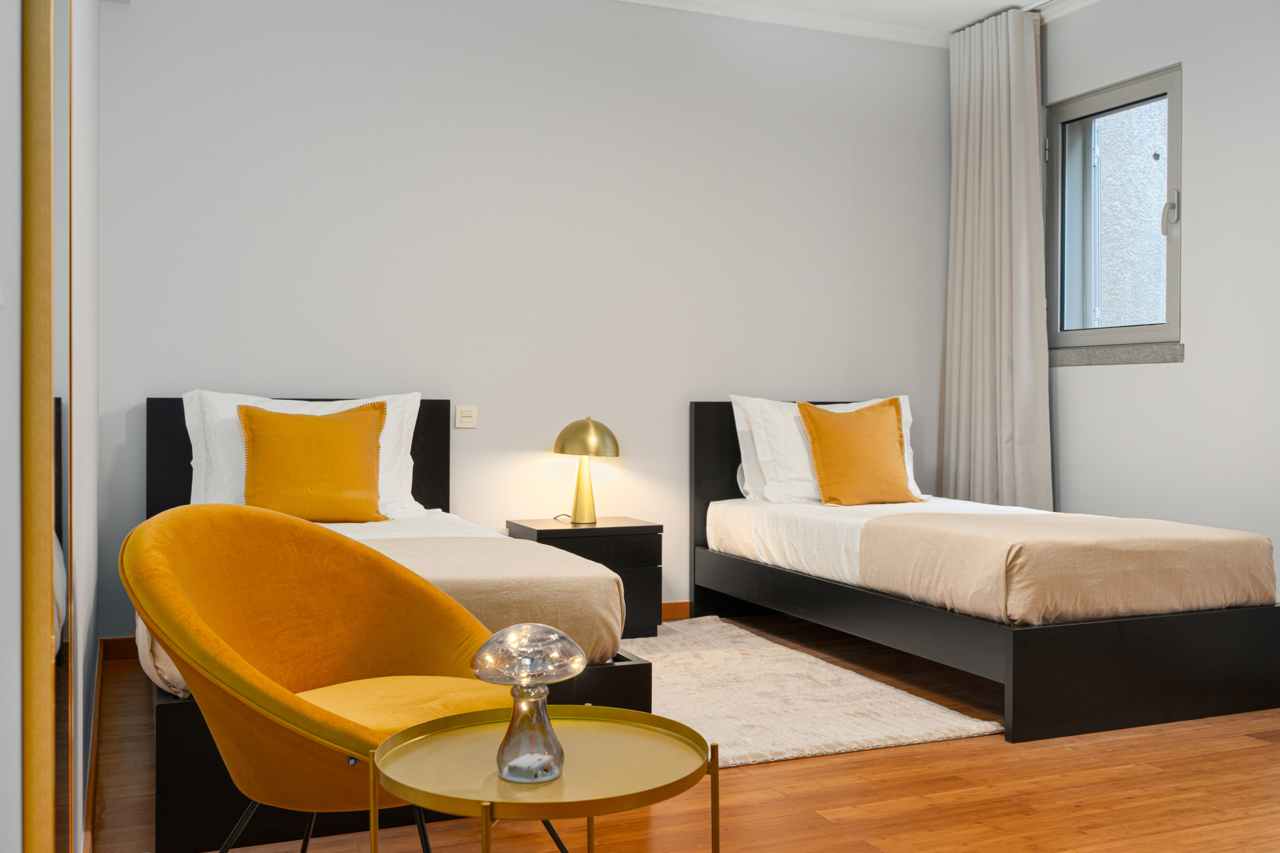 O quarto principal apresenta uma decoração elegante, uma confortável cama de casal king size e uma casa de banho privativa com banheira, ideal para quem valoriza privacidade e bem-estar, contando ainda com acesso a uma pequena varanda. O segundo quarto, banhado por luz natural, oferece uma cama de casal e uma charmosa varanda com vista sobre a cidade de Câmara de Lobos, perfeita para apreciar o ambiente da vila. O terceiro quarto, decorado em tons amarelos, dispõe de duas camas individuais, complementadas por uma mesa e cadeira, criando um espaço acolhedor para leitura ou momentos de tranquilidade.