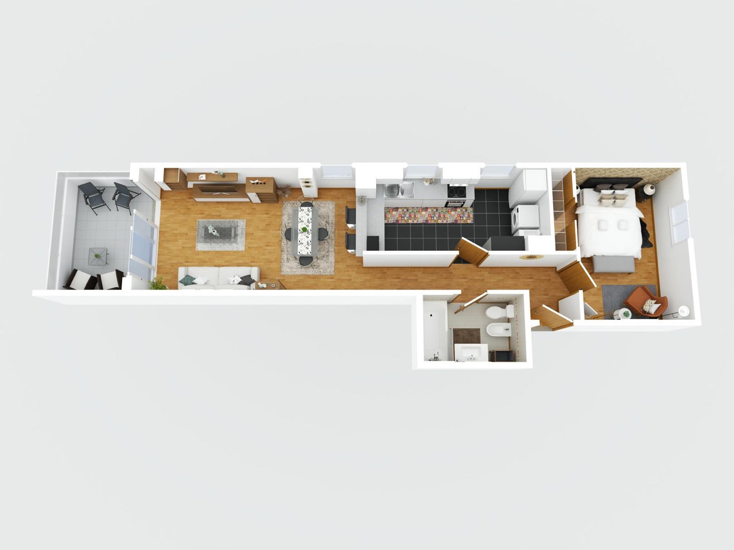 Com acesso direto à varanda, a sala oferece o cenário ideal para começar o dia com um café ou terminar a noite apreciando a vista tranquila da cidade.