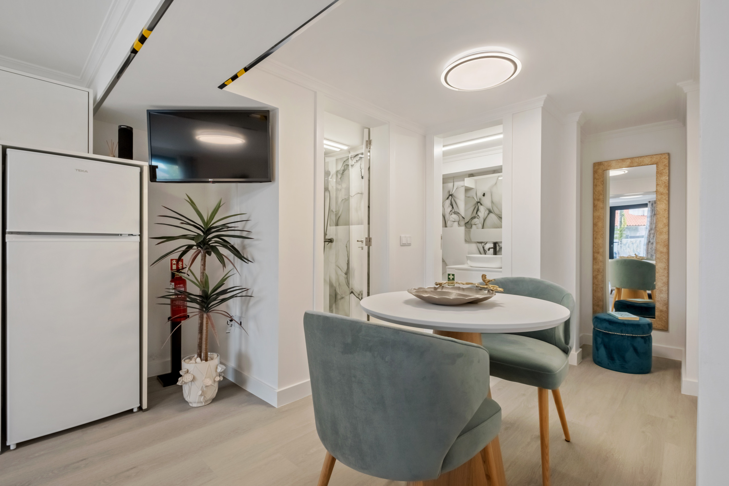 Cada estúdio foi cuidadosamente decorado para criar ambientes harmoniosos e acolhedores, onde o design e o bem-estar caminham lado a lado. Apesar das diferenças visuais, todos partilham o mesmo conceito: espaços práticos, bem organizados e pensados para proporcionar uma estadia leve e sem preocupações.