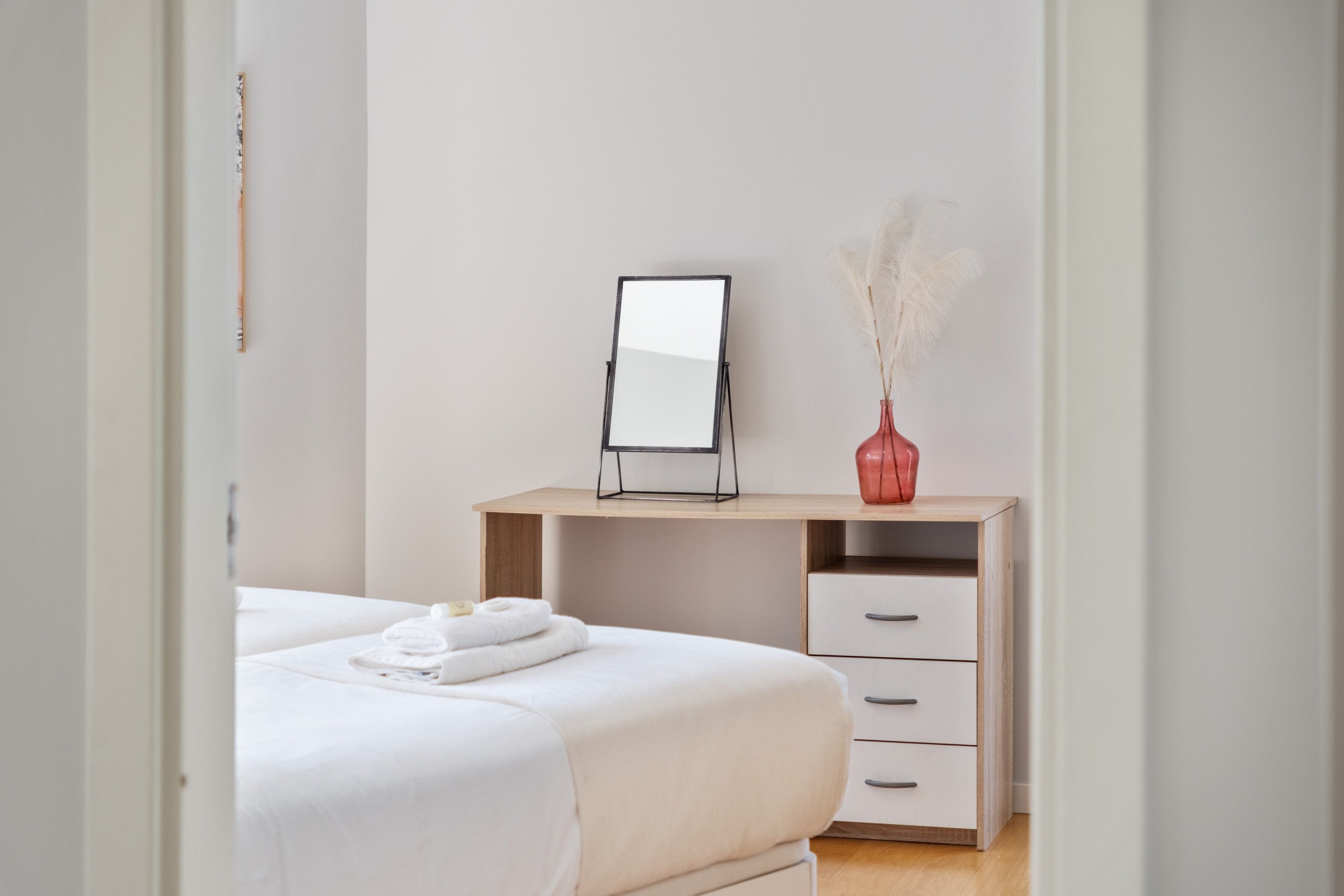 O apartamento é luminoso e elegantemente decorado, pensado para acolher até quatro pessoas. O quarto principal dispõe de uma cama king size, perfeita para casais, enquanto a sala de estar conta com um sofá-cama de casal, ideal para acomodar adultos ou crianças.