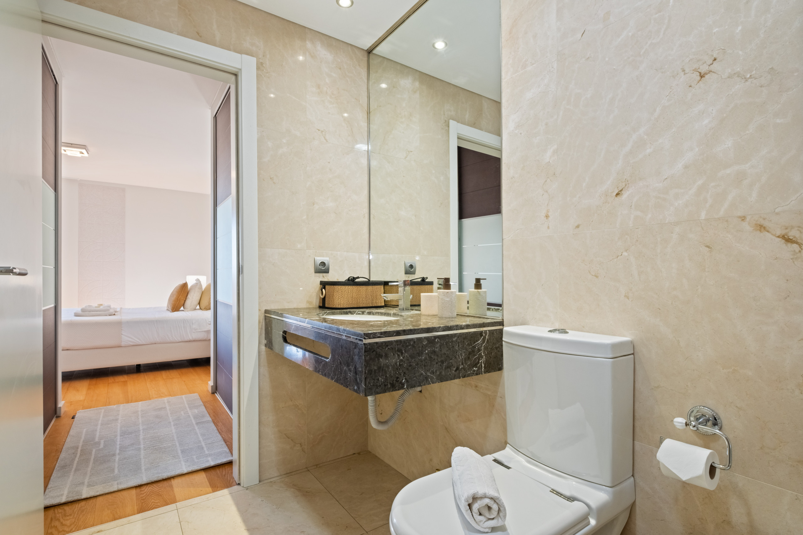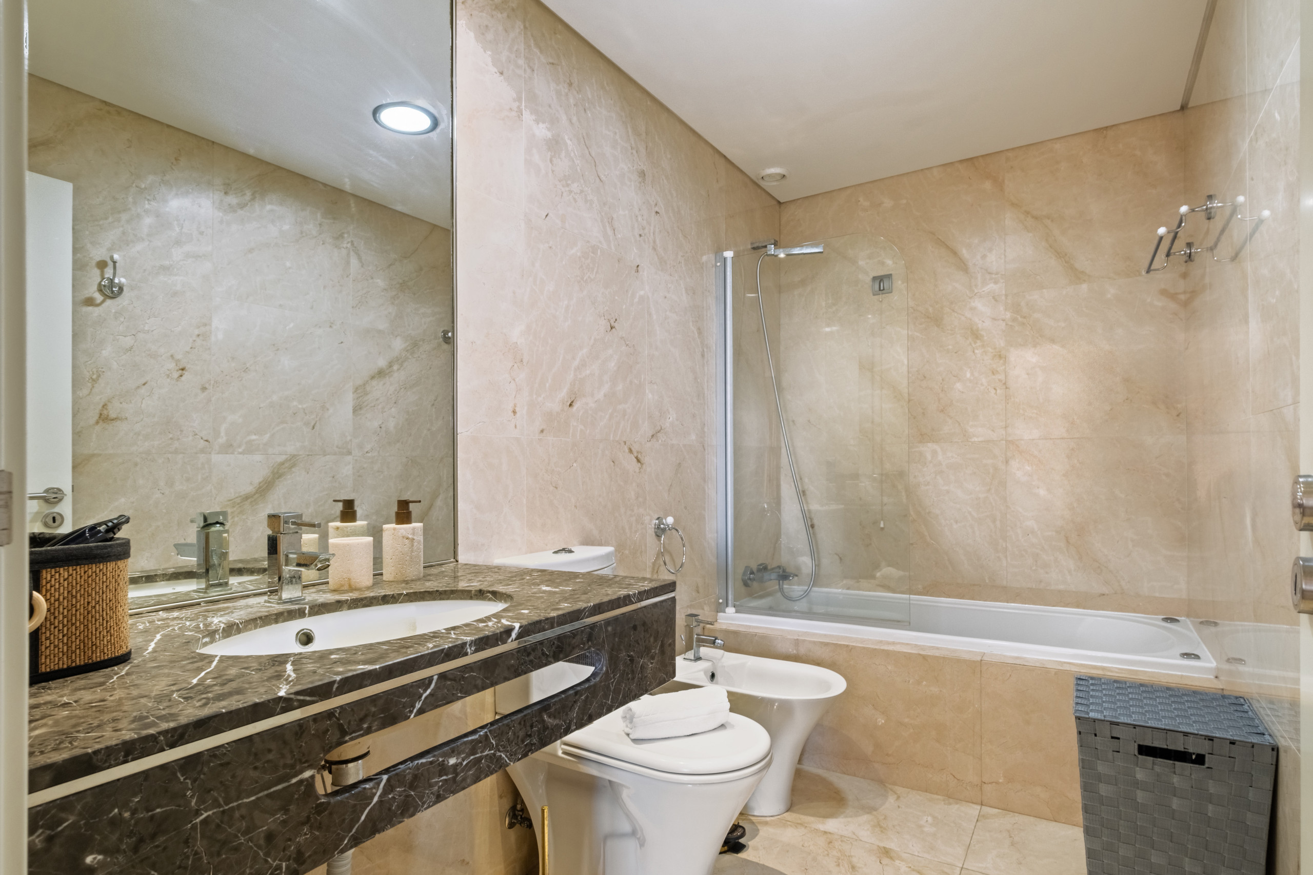 O apartamento dispõe ainda de uma casa de banho privativa e uma casa de banho comum, ambas com banheira, oferecendo conforto e conveniência para todos os hóspedes.