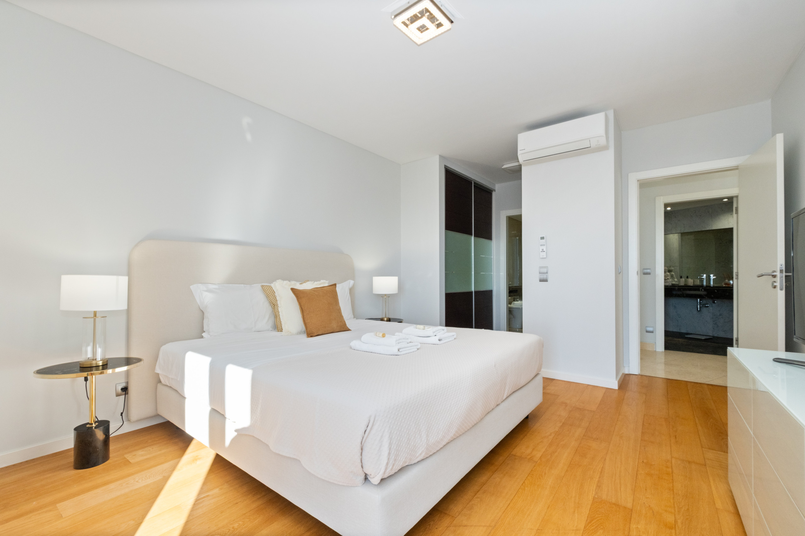 O espaço foi pensado para acomodar até quatro pessoas. O quarto principal conta com uma cama king size, ideal para casais, enquanto a sala de estar dispõe de um sofá-cama de casal, perfeito para adultos ou crianças. A área de refeições integrada com a cozinha totalmente equipada permite preparar desde pequenos-almoços rápidos até jantares descontraídos, tornando cada momento prático e agradável.