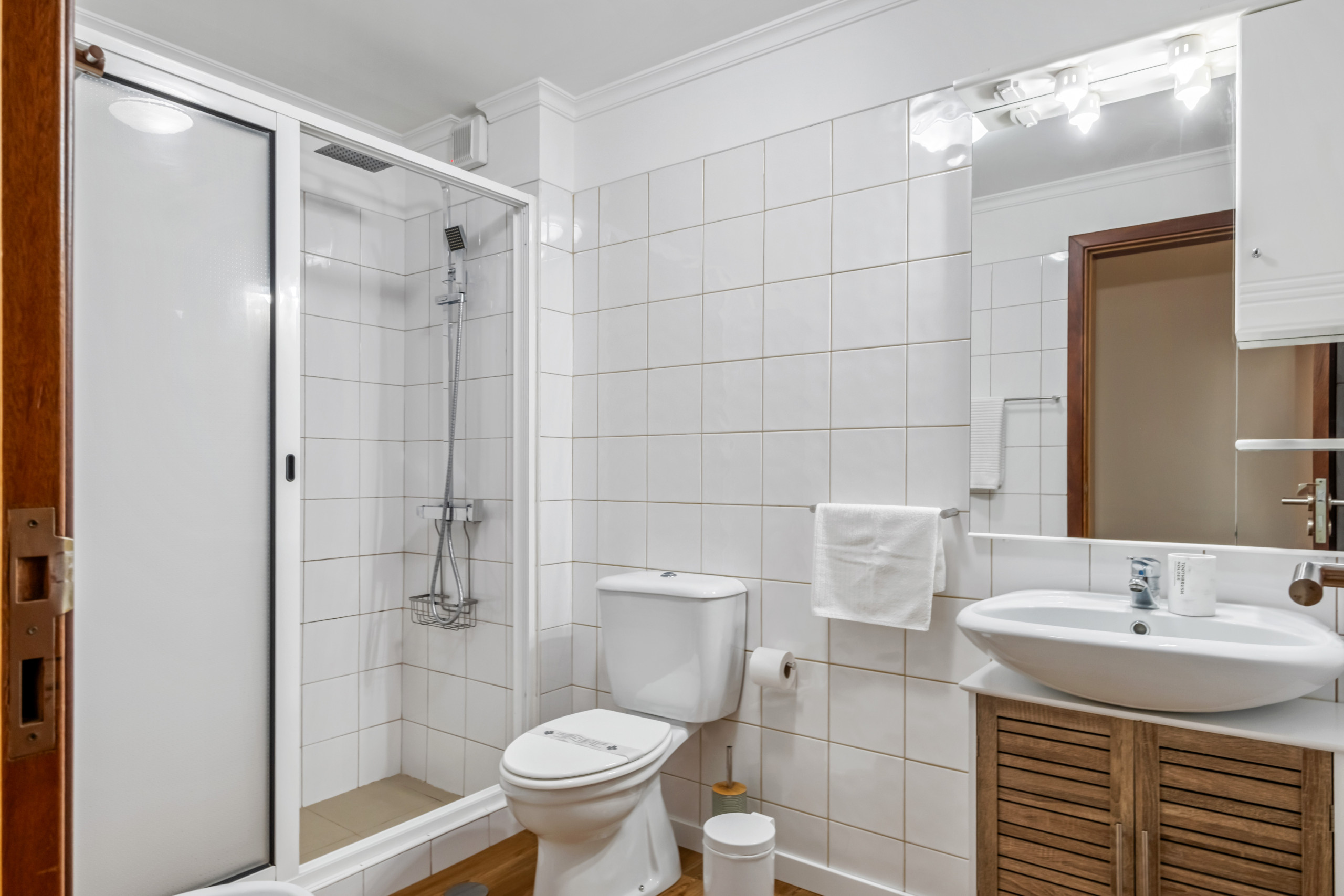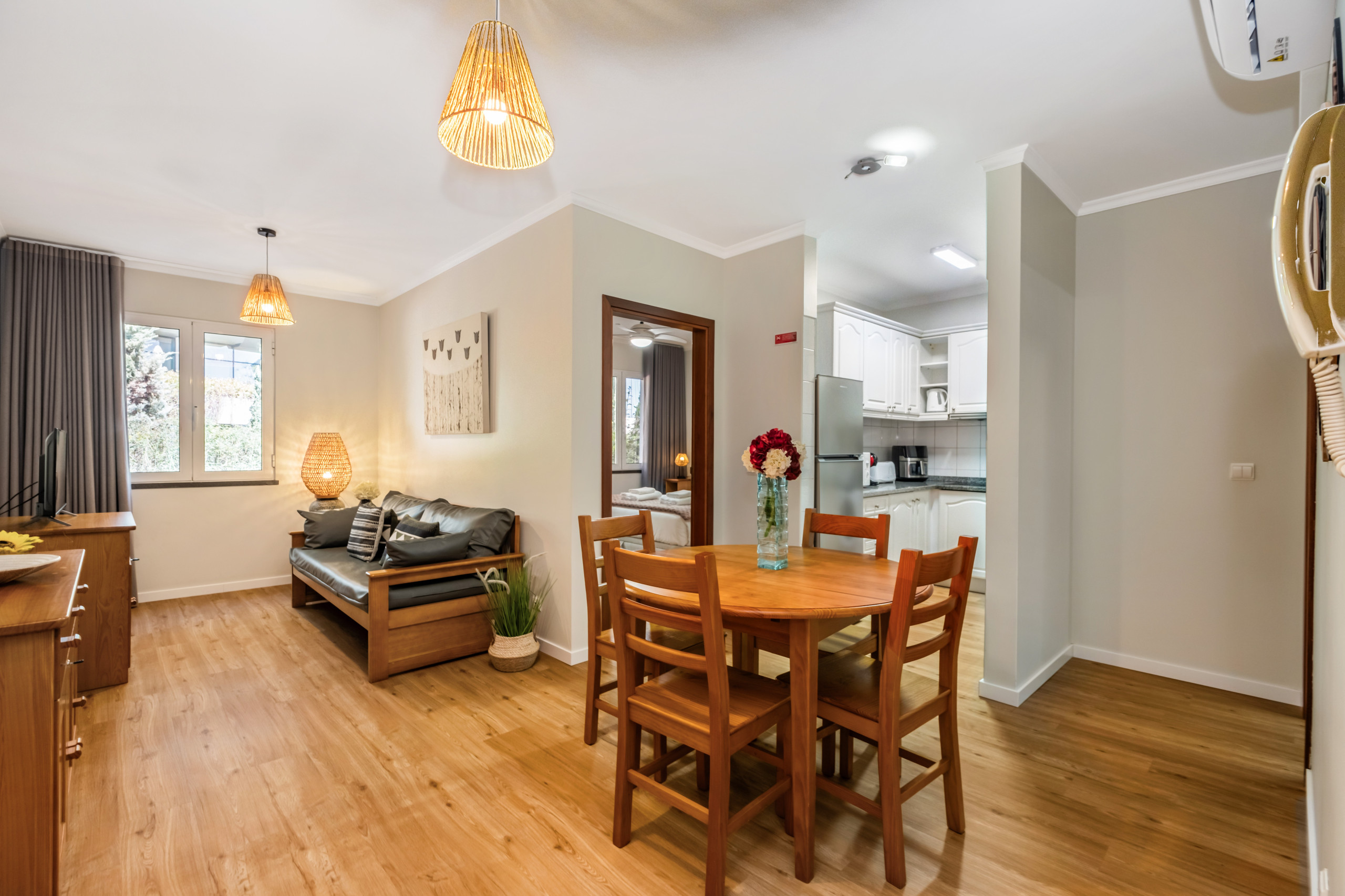 O apartamento dispõe ainda de um quarto confortável com cama de casal, pensado para proporcionar noites tranquilas e revigorantes, complementado por um roupeiro funcional que garante organização e praticidade durante toda a estadia.