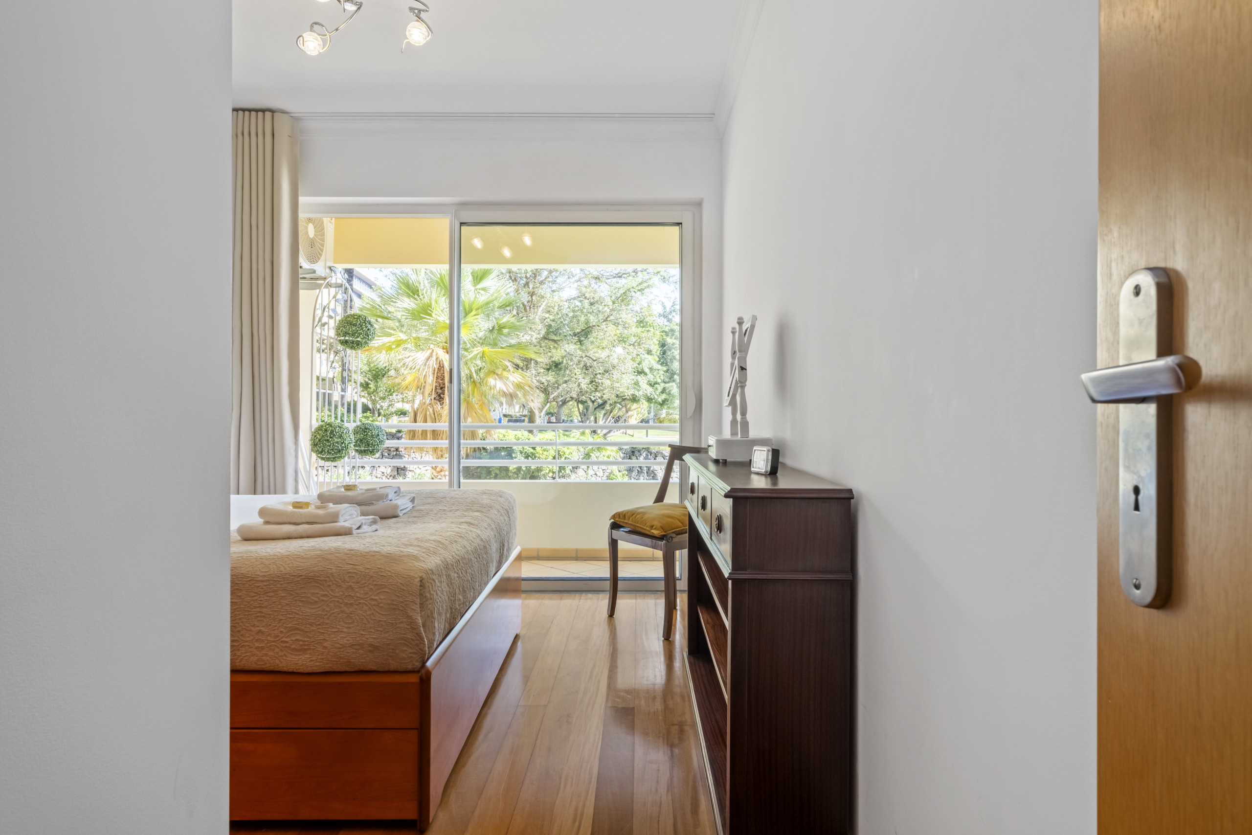O espaçoso e luminoso quarto convida ao bem-estar, com acesso direto a uma varanda encantadora, onde uma área de refeições ao ar livre proporciona momentos inesquecíveis.