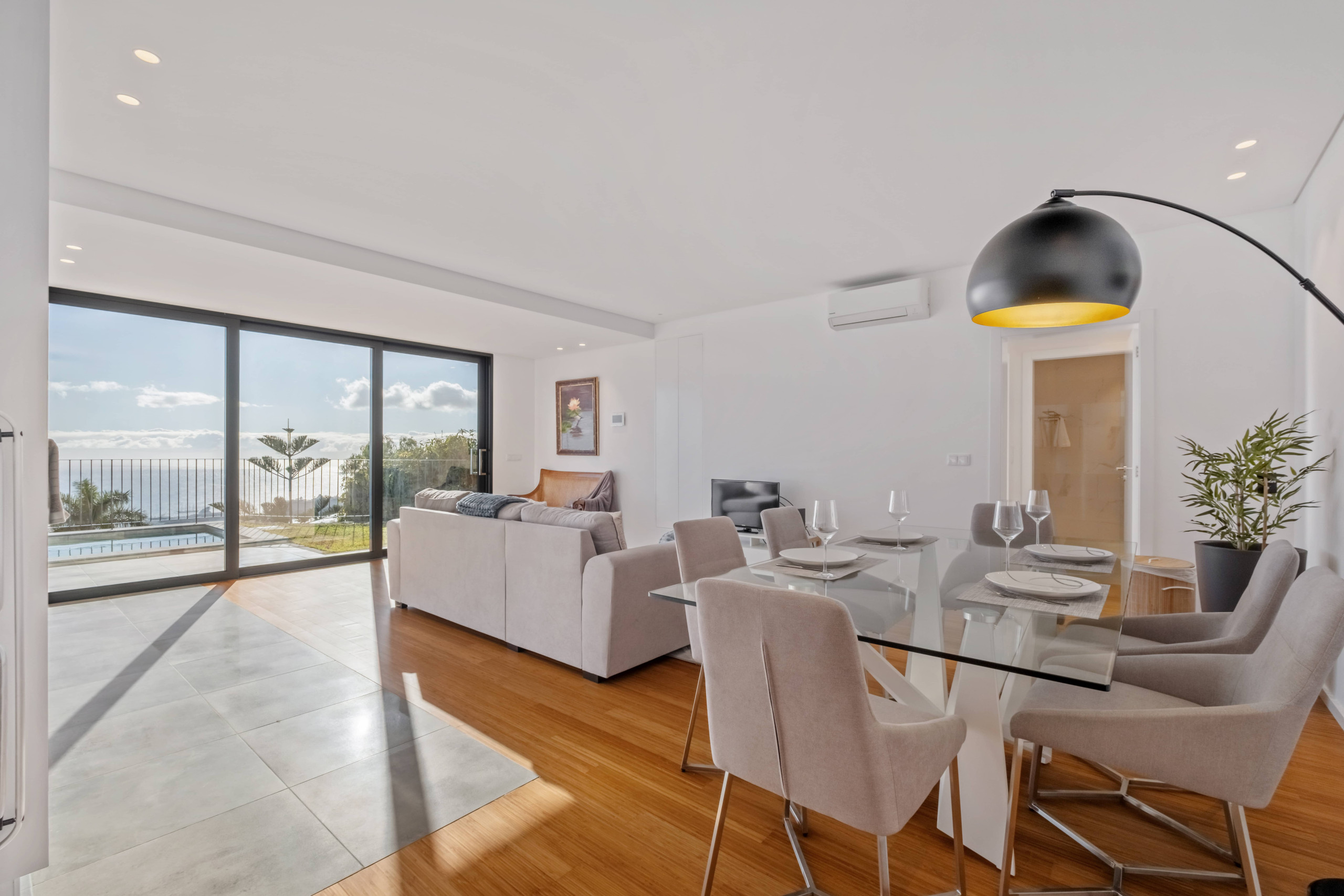 A zona social é ampla, luminosa e acolhedora, integrando de forma harmoniosa a sala de estar, a cozinha e a área de refeições. Este espaço foi pensado para momentos de convívio, seja para partilhar refeições, relaxar no sofá, ler um livro ou simplesmente apreciar a vista que se estende até ao oceano. A cozinha, totalmente equipada, oferece todas as condições para preparar desde refeições simples a jantares especiais, sempre com conforto e funcionalidade.