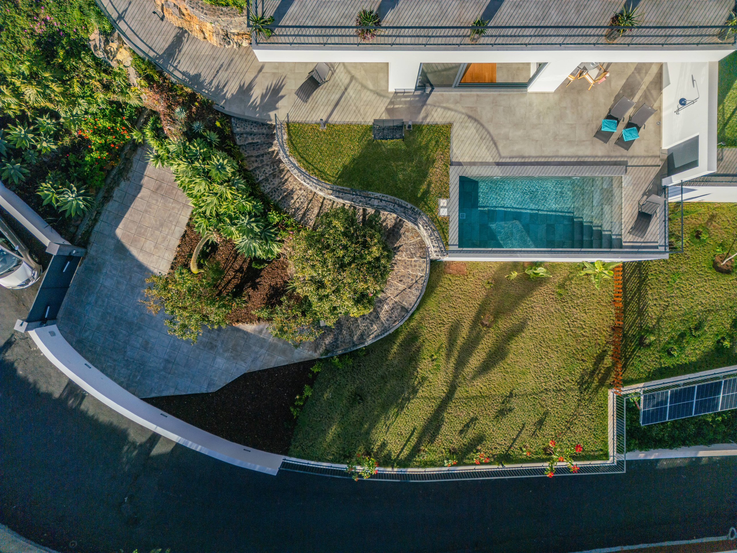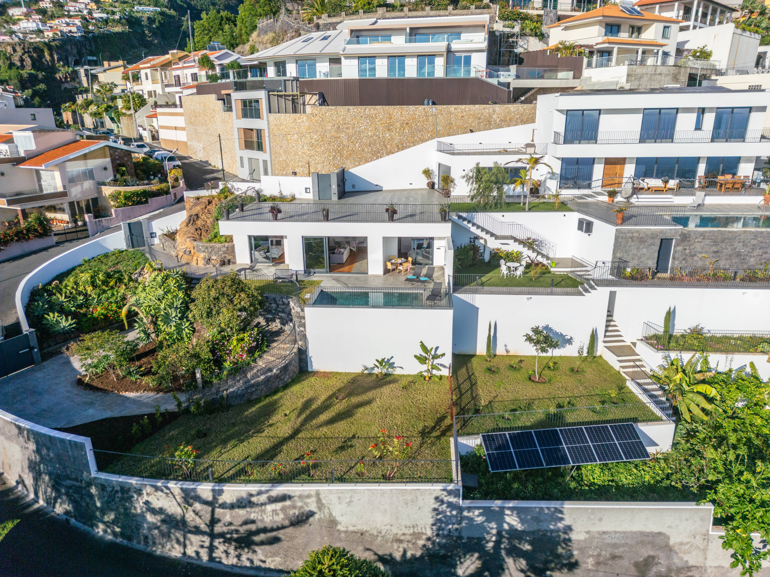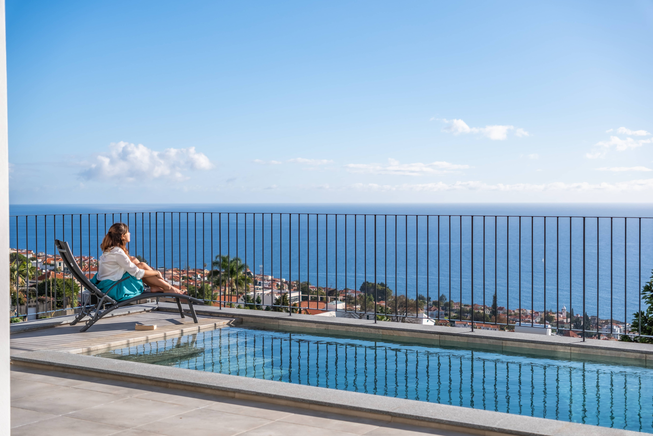 O verdadeiro ex-líbris desta propriedade é a sua majestosa área exterior, cuidadosamente pensada para proporcionar momentos de puro relaxamento. Jardins verdes e bem cuidados, zonas de sombra, bancos estrategicamente posicionados e recantos encantadores criam um ambiente sereno que convida a abrandar o ritmo e a desfrutar plenamente da estadia. Ao centro deste cenário encontra-se a piscina privada, que se destaca pela sua vista deslumbrante sobre o mar e a baía do Funchal — um cenário simplesmente inesquecível, onde cada mergulho se transforma num momento especial.