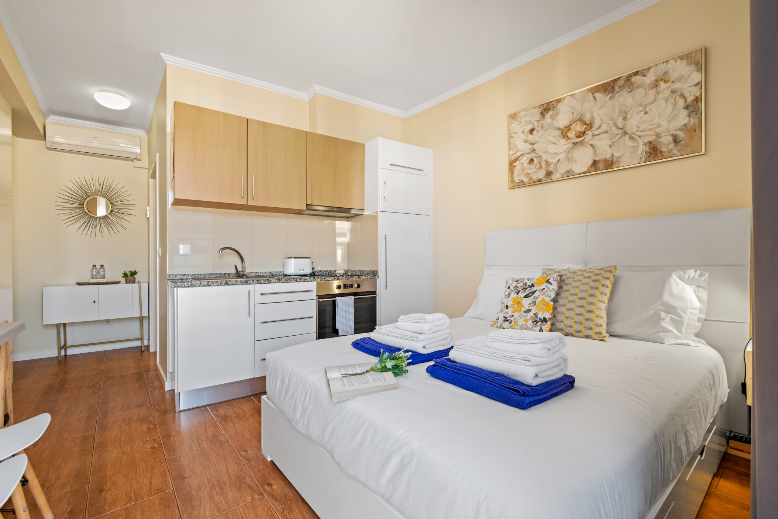 Ao entrar, encontra um espaço funcional e bem organizado, composto por um quarto com cama de casal, guarda-roupa e uma pequena secretária, ideal para quem precisa de conciliar lazer com trabalho.