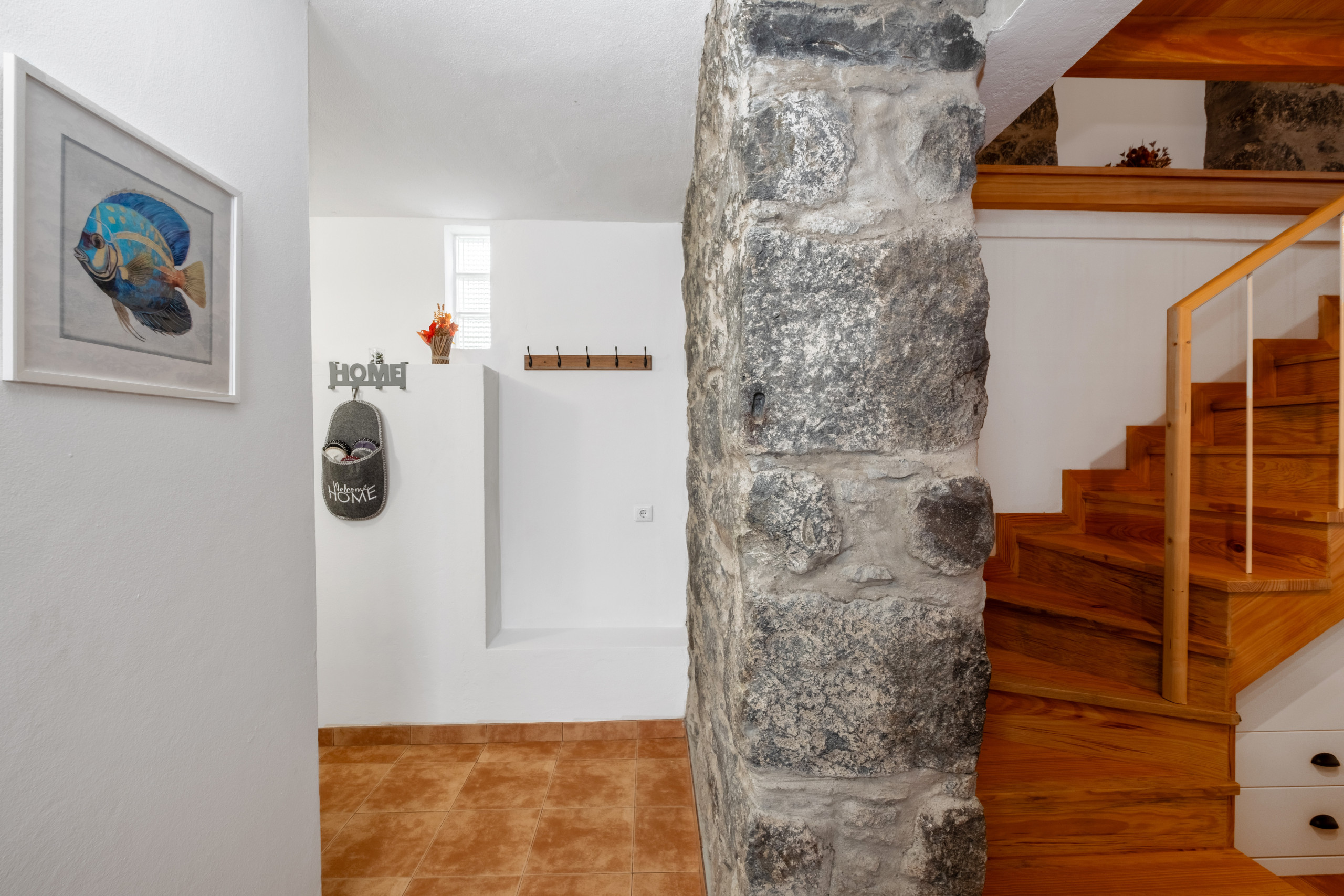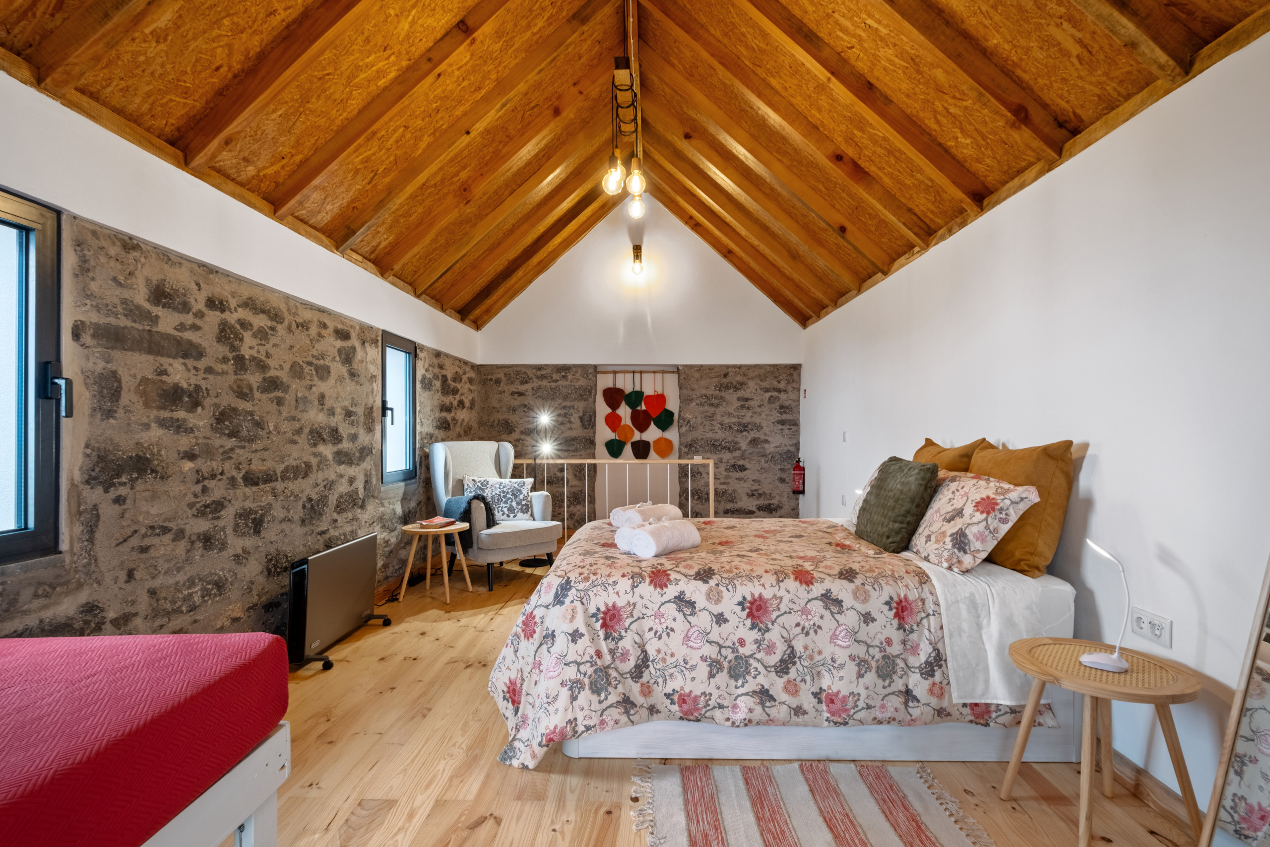 Upon ascending to the upper floor, you are greeted by an inviting room with a comfortable double bed. The space also features a wardrobe for clothing organisation and a cosy armchair — perfect for enjoying the tranquillity of the afternoon with a good book.