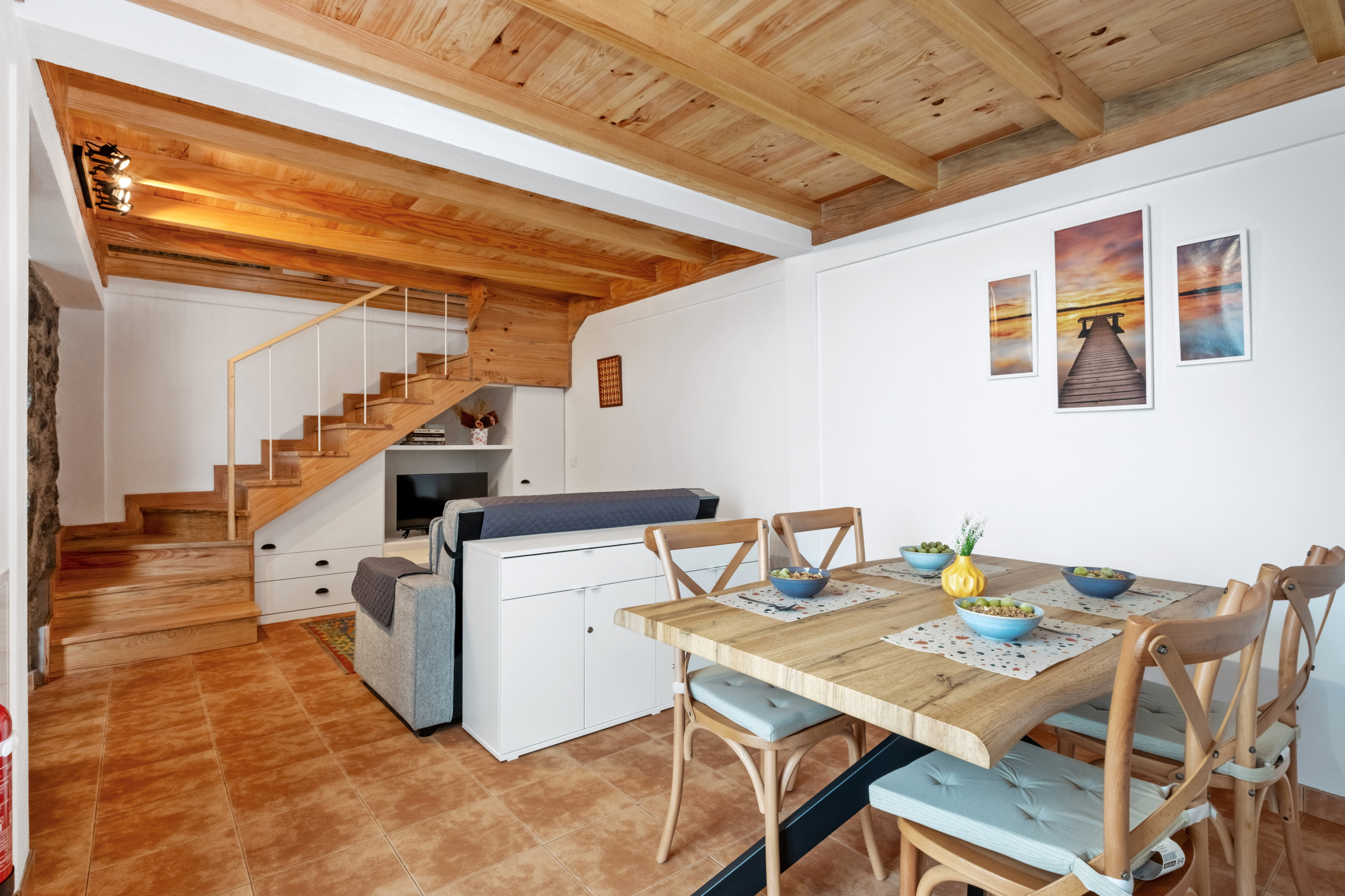 On the lower floor, the open-plan living room integrates the kitchen and dining area, creating a harmonious and inviting space, perfect for socialising and sharing moments with family or friends. A comfortable sofa and the television complete the environment, ensuring moments of relaxation and entertainment.